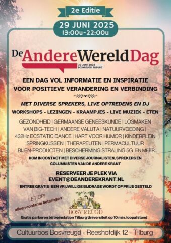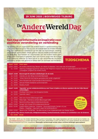 Op zondag 29 juni vond de tweede editie van De Andere Wereld Dag plaats bij Bosvreugd in Tilburg. Elpaso Media heeft hier de hele dag live verslag van gedaan. Naast ons eigen Elpaso team (Ed, Gaby, Ellen, Ray, Sjef & Sjaak) hebben er nog drie geweldige gast-presentatoren aangesloten, te weten; Rico Brouwer, Peter van Asselt en Steven Walker. Verschillende gasten kwamen aan tafel en diverse onderwerpen werden besproken. Daarnaast zijn er ook mooie interviews afgenomen, sfeerbeelden gefilmd en foto’s gemaakt. Wij wensen u dan ook heel veel kijk en luistere plezier!