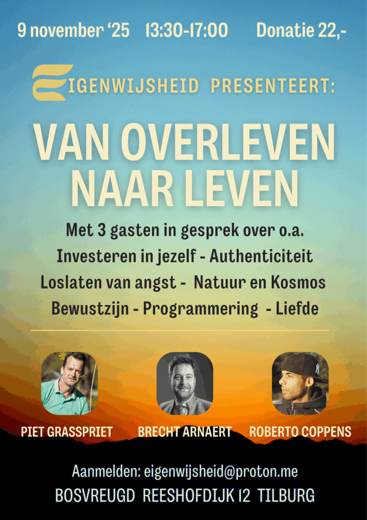 Laat je op zondagmiddag 9 november ’25 inspireren door Brecht Arnaert, Piet Grasspriet (Coen de Mooy) en Roberto Coppens. Deze 3 heren delen hun verhalen, kennis, eigen ervaringen, ideeën en tips over onderwerpen als hoe je kunt Investeren (ook in jezelf), Authenticiteit, Bewustzijn, Natuur, Liefde en nog veel meer. Ook Ellen/Moos (EigenWijsheid) zal als gastvrouw deelnemen aan de gesprekken m.n. over programmering.